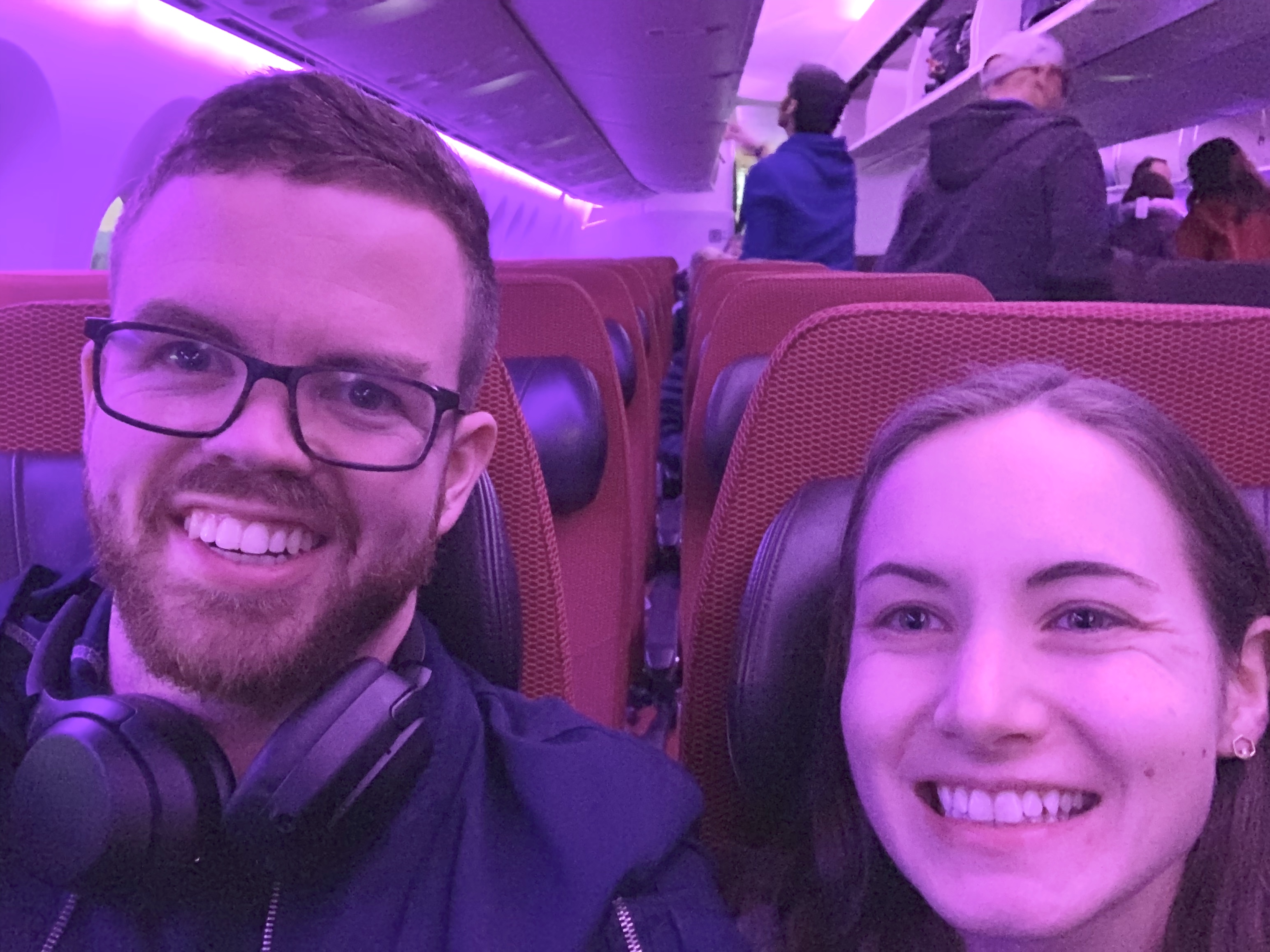 We are on a Boeing Dreamliner, and have enjoyed playing with the dimmers on the windows. Next stop, London!!