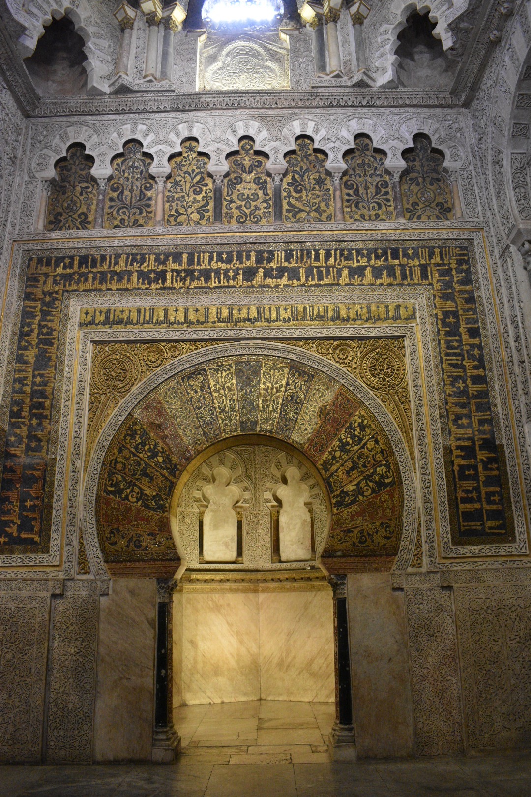 On one side of the former mosque is the mihrab, essentially the Muslim version of a high altar. The prayer leader, imam, would stand here to read scripture and give sermons. It is made of over 3,000 pounds of shimmering multi-colored glass-and enamel-cubes forming mosaics. The imam would stand with his back to the crowd, allowing the structure of the mihrab niche to carry his voice to the crowd (which could number 20,000 people).