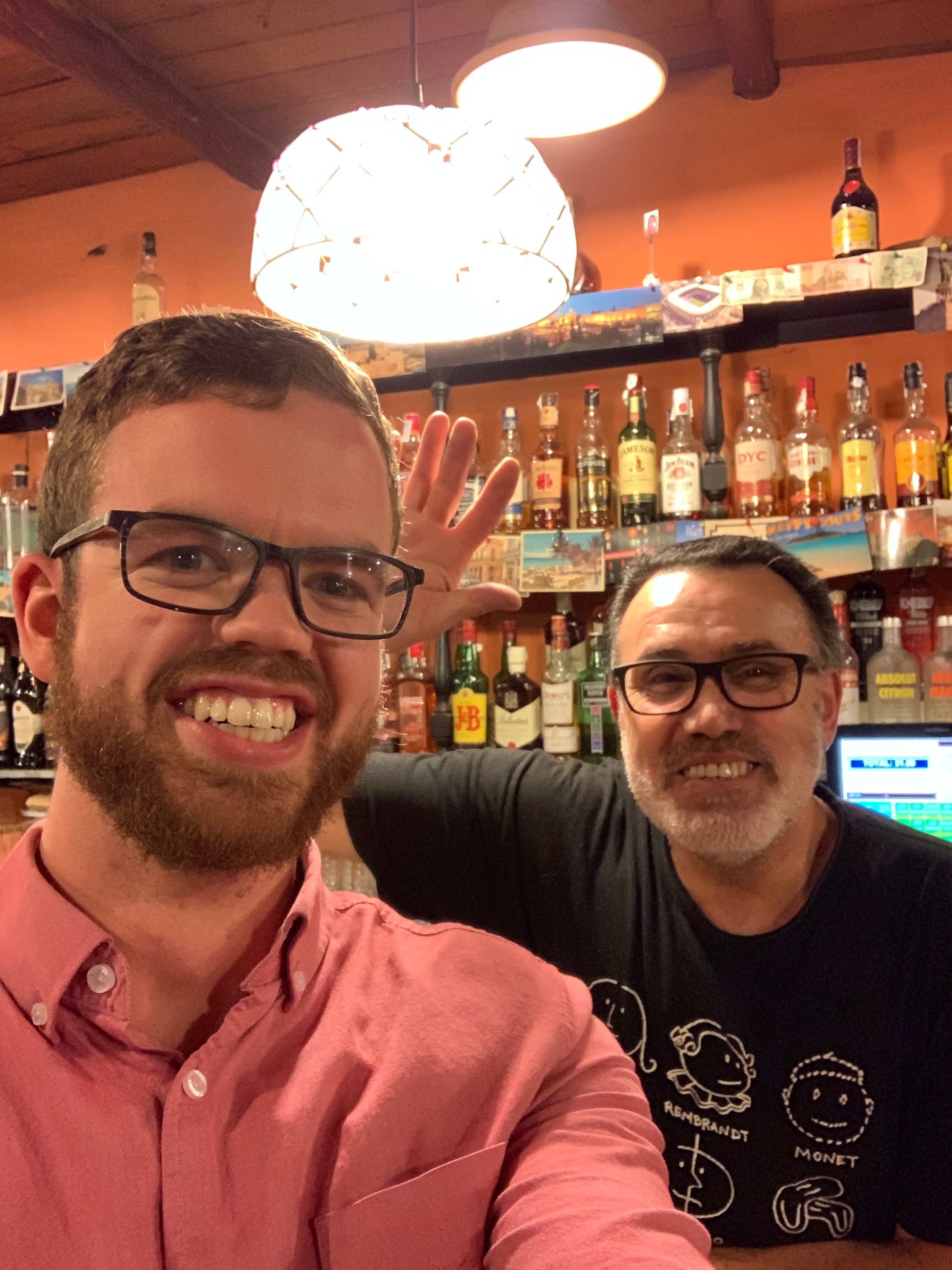 Slightly tipsy, we wandered over to Triana, where Nate used to live. We went to a bar he used to frequent, T de Triana. The owner of the bar was working and we grabbed seats at the bar and ordered drinks. Nate started a conversation with Paco (owner) and he remembered Nate. They had a lovely conversation catching up on the last six years. Nate spent quite a bit of time hanging out at this bar and even performed a show there. I think Paco was very touched that he returned and he treated us to drinks, jamon iberico, and cheese. They took a picture together to remember the night.