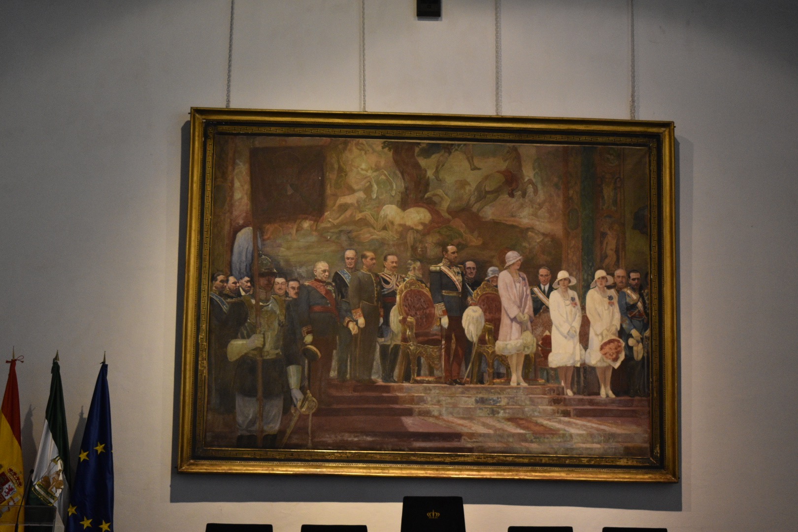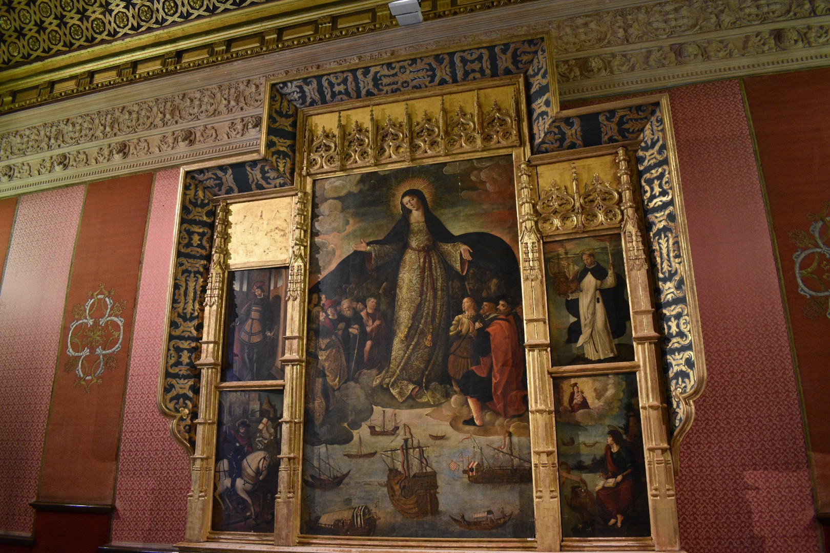 Next we saw the Admiral's Hall. This hall was ordered to be built by Queen Isabel in 1503 to administer to Spain's New World ventures. The room where we focused most of our time was the Audience Chamber. The altarpiece painting, St. Mary of the Navigators (Alejo Fernandez, 1530s) depicts the Virgin Mary keeping watch on the ships with Christopher Columbus kneeling next to her and Native Americans in the dark background of her cloak. It is fitting to have this painting in the Audience Chamber as Christopher Columbus spent time in this exact room recounting his adventures to the Spanish royals.