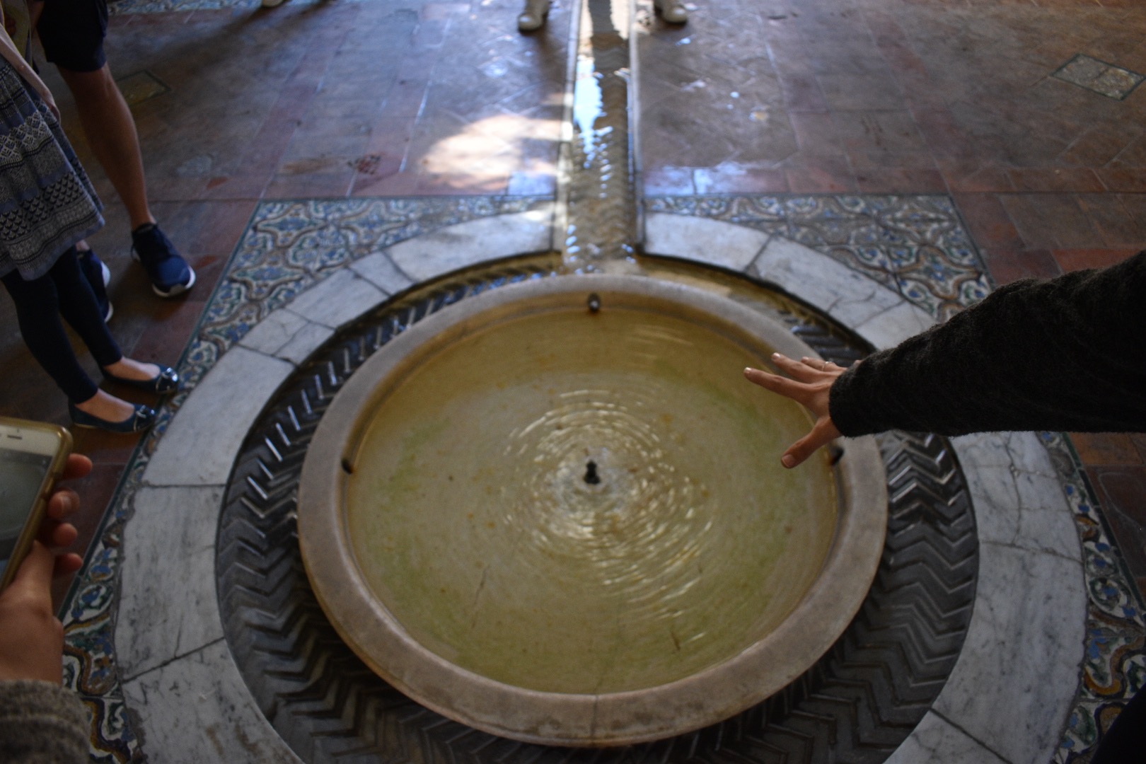 Our tour was divided into sections and the first section was the oldest part of the palace. The entire palace is decorated in Mudejar style, a mix of Islamic and Christian elements. The courtyard where we started our tour had remnants from the original palace. We stepped into a structure that remains from the Moorish palace and has the typical fountain in the middle for washing feet.