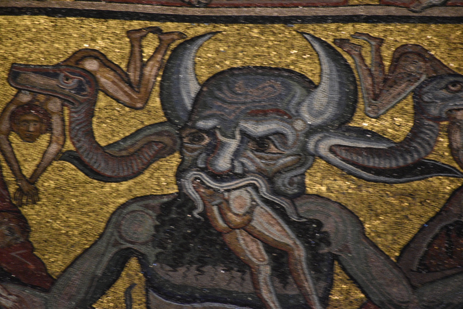 We also saw the Baptistery. It has beautiful ceiling mosaics that workers from Venice put together in the late 1200s. One side has Christ depicted in The Last Judgement, giving the thumbs up to those on his right and the thumbs down to those on his left.