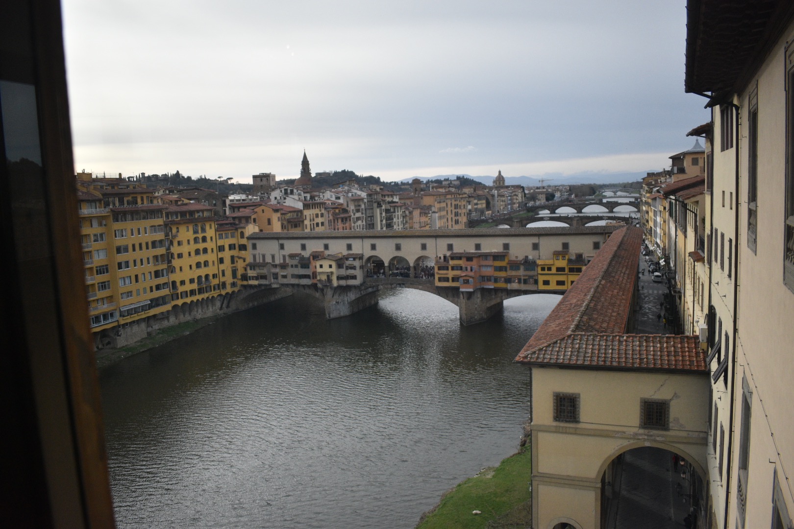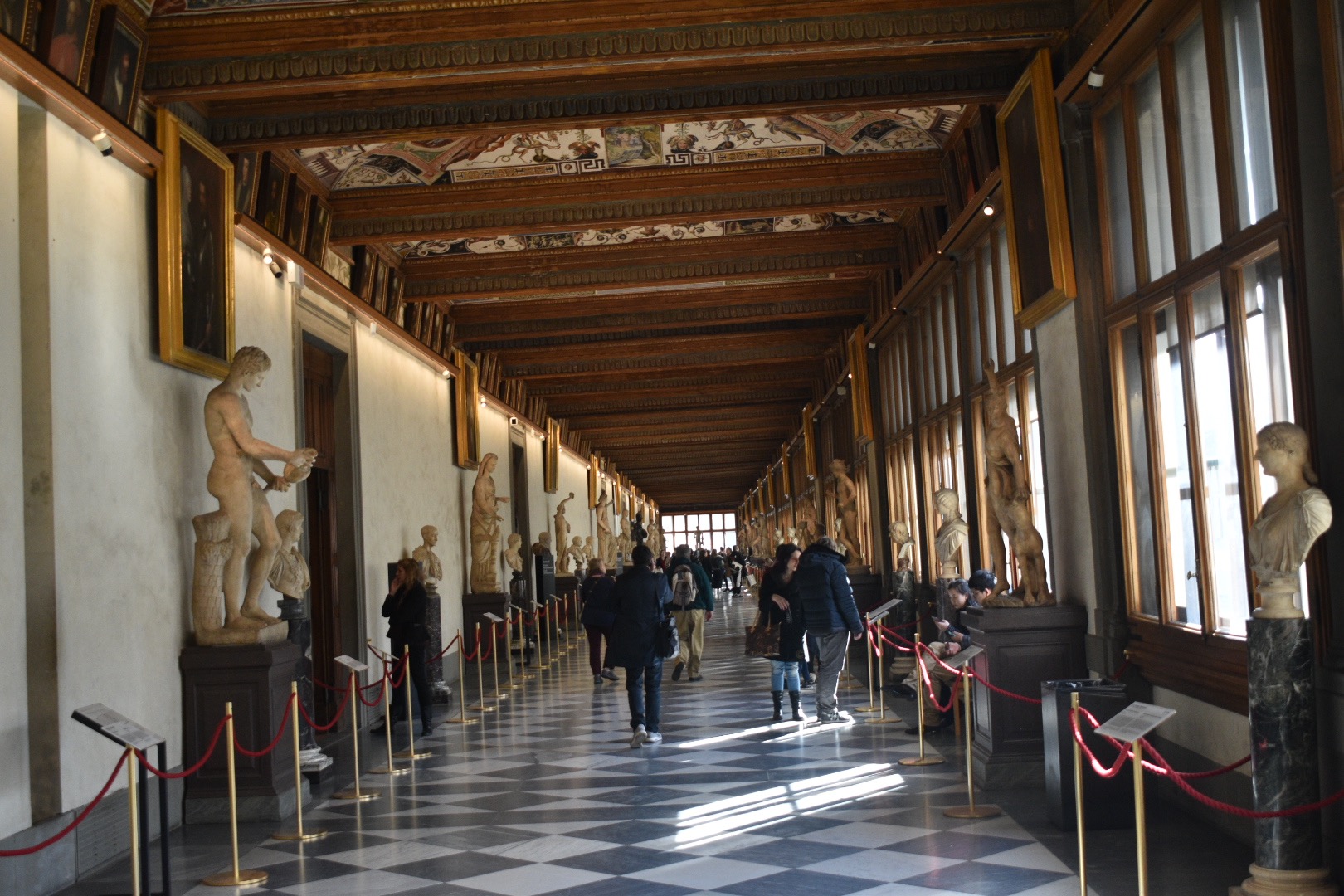 The hallway of the Uffizi is lined with statues and the paintings of nobleman. There is also a fantastic view of the Arno from the windows.