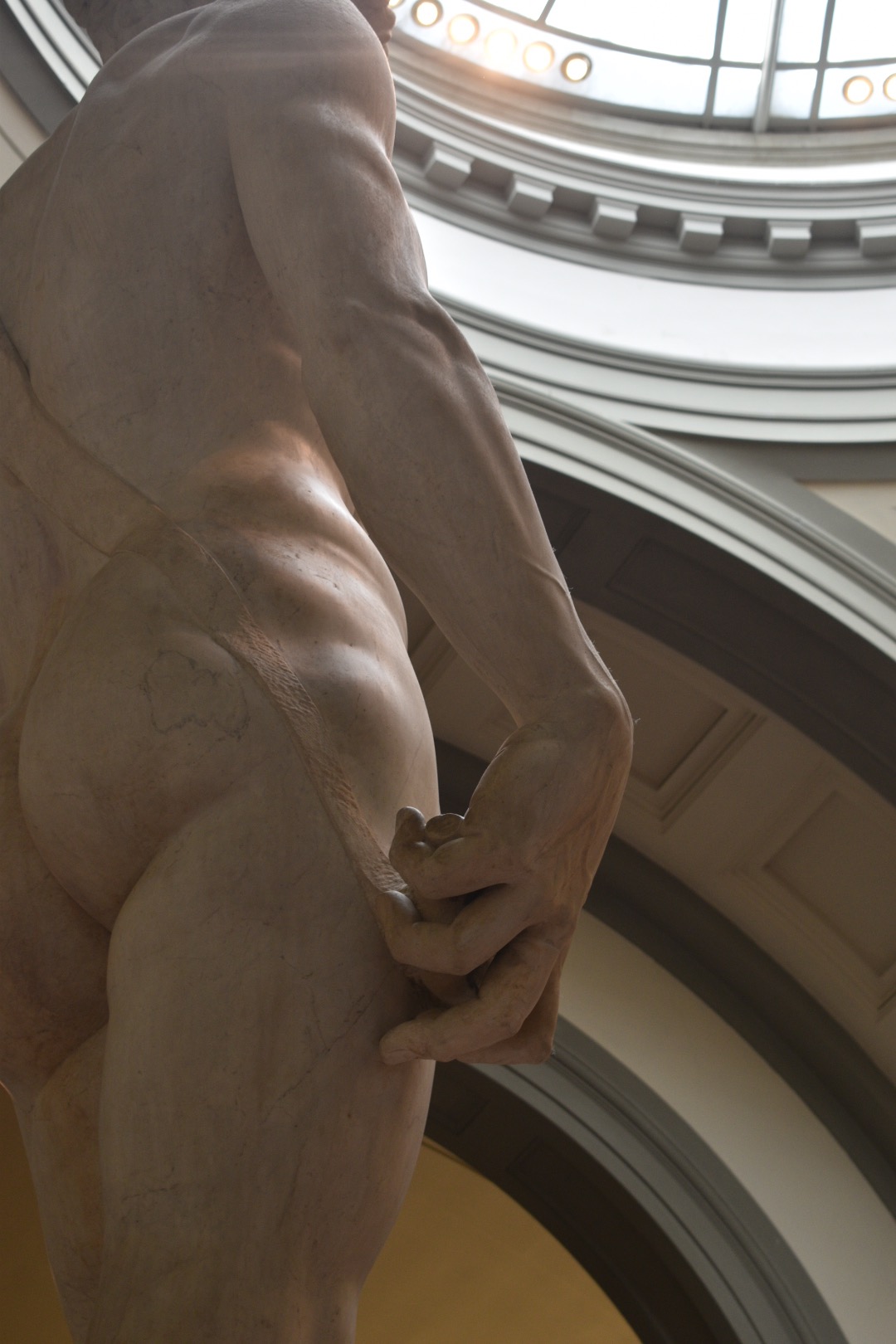 The detail in the statue is exquisite, you can see his carved muscles, his ribs, and even the veins in his arms. His curly hair completes his disproportionate head.