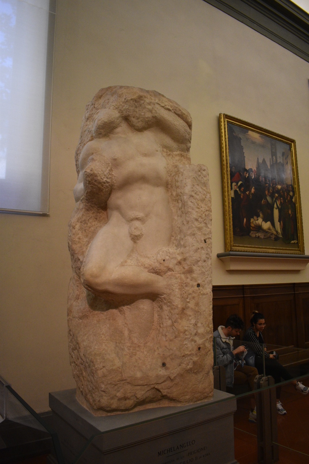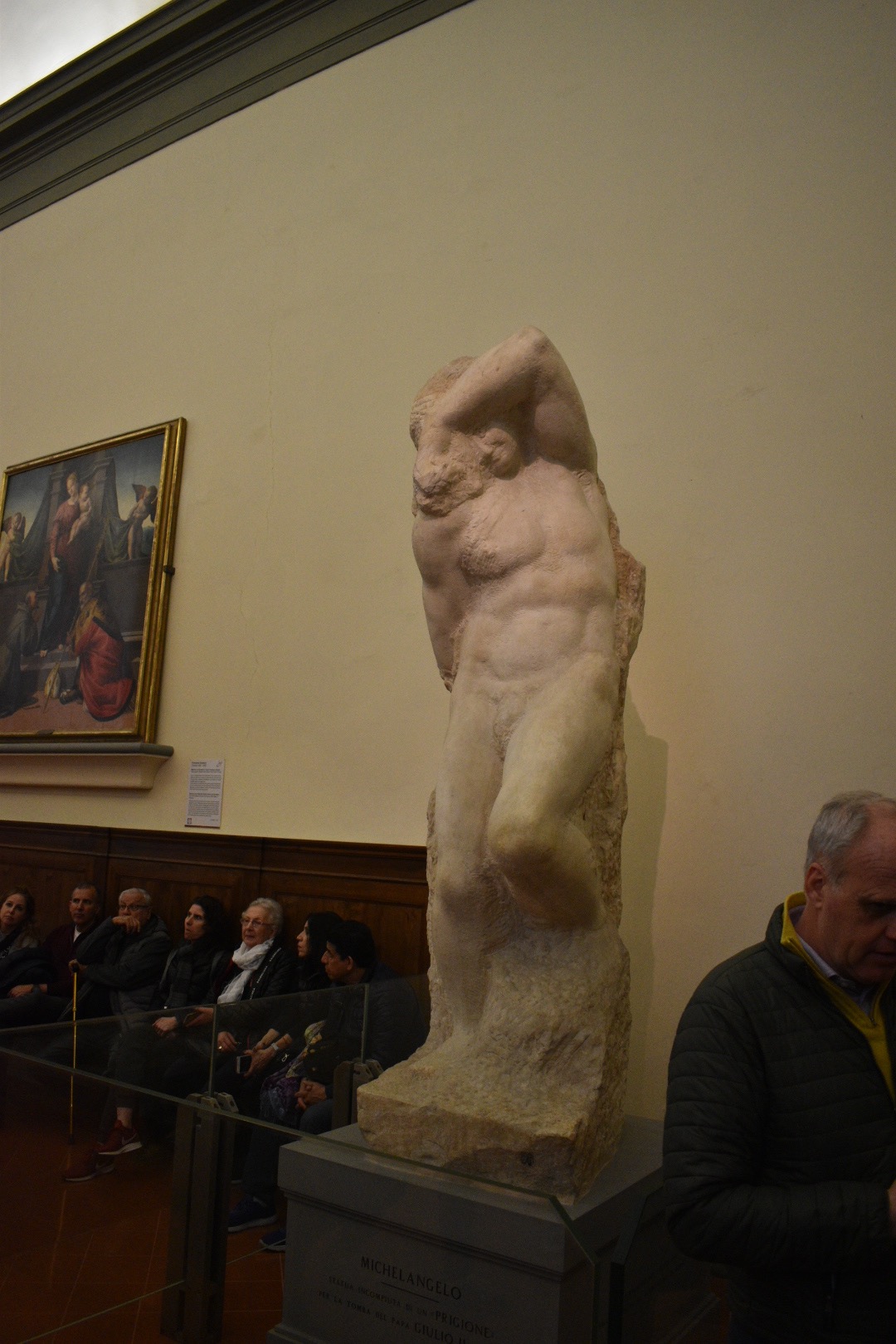 David is at the end of a long hallway that is lined with Michaelangelo's unfinished Prisoners. Although the Prisoners are unfinished, it's absolutely wonderful to study them and gain somewhat of an understanding of the sculpting process. They are also all at various stages of completion and you get a feel of the long and tedious process Michaelangelo followed.